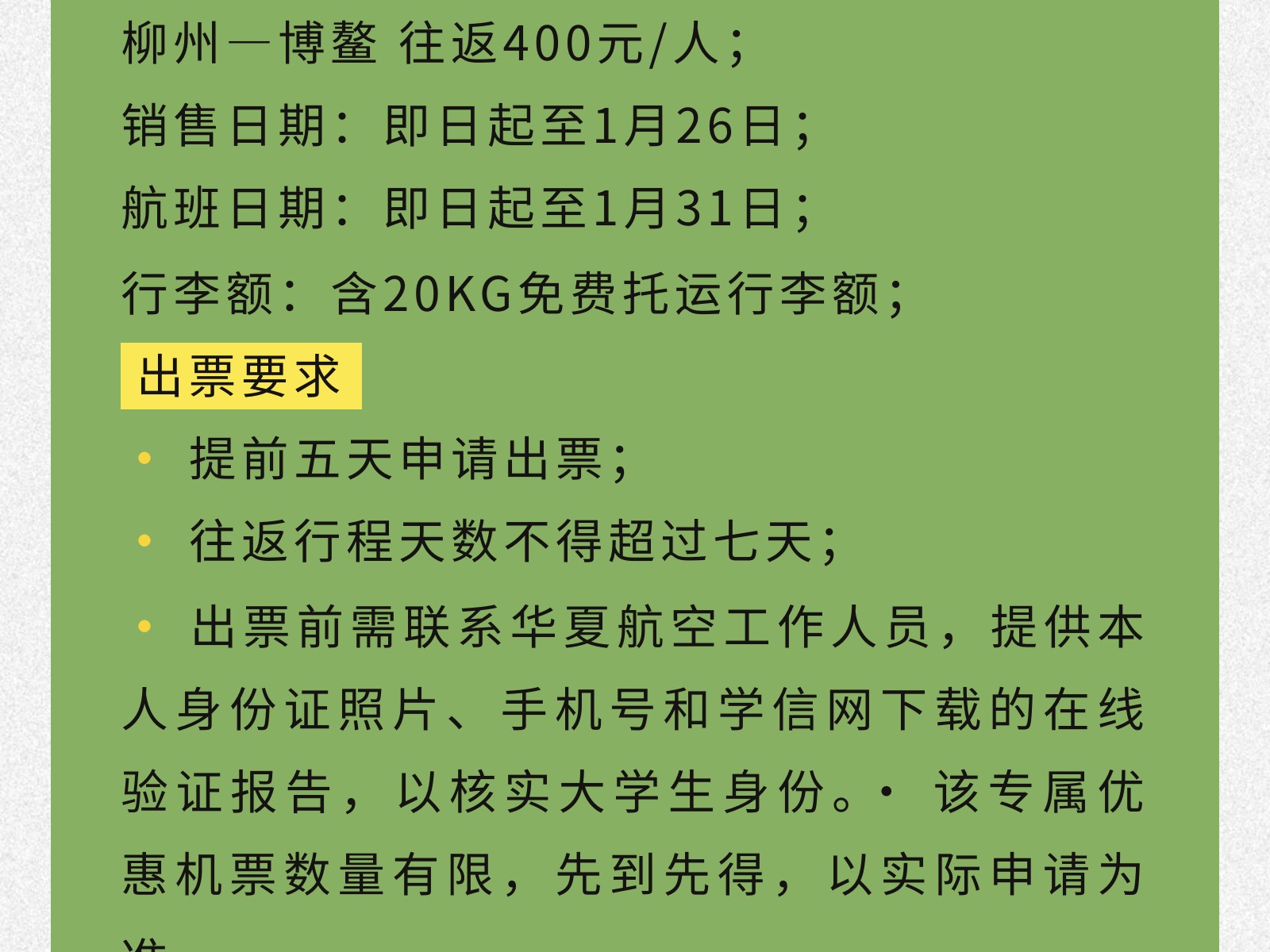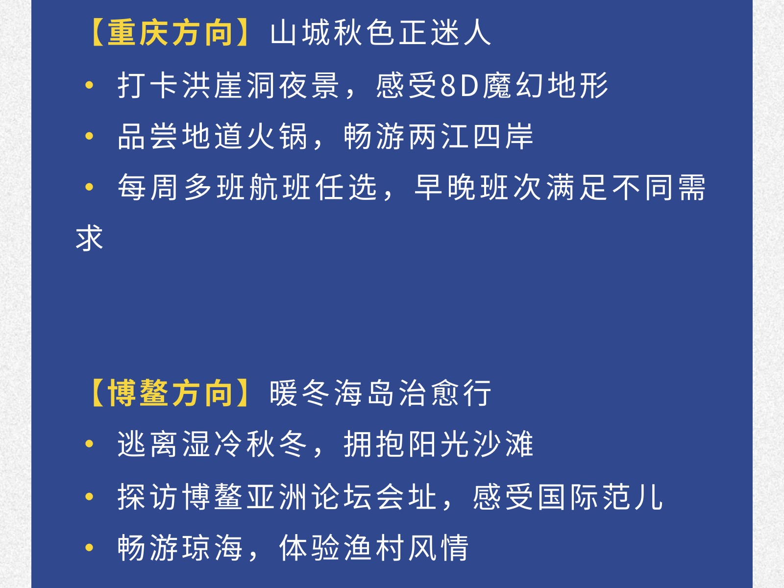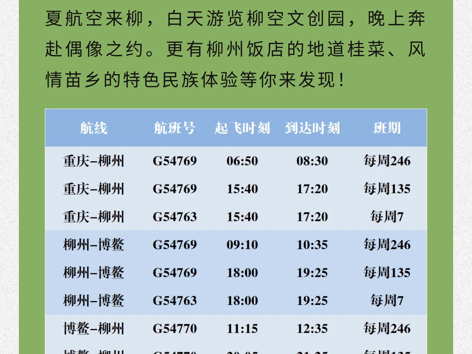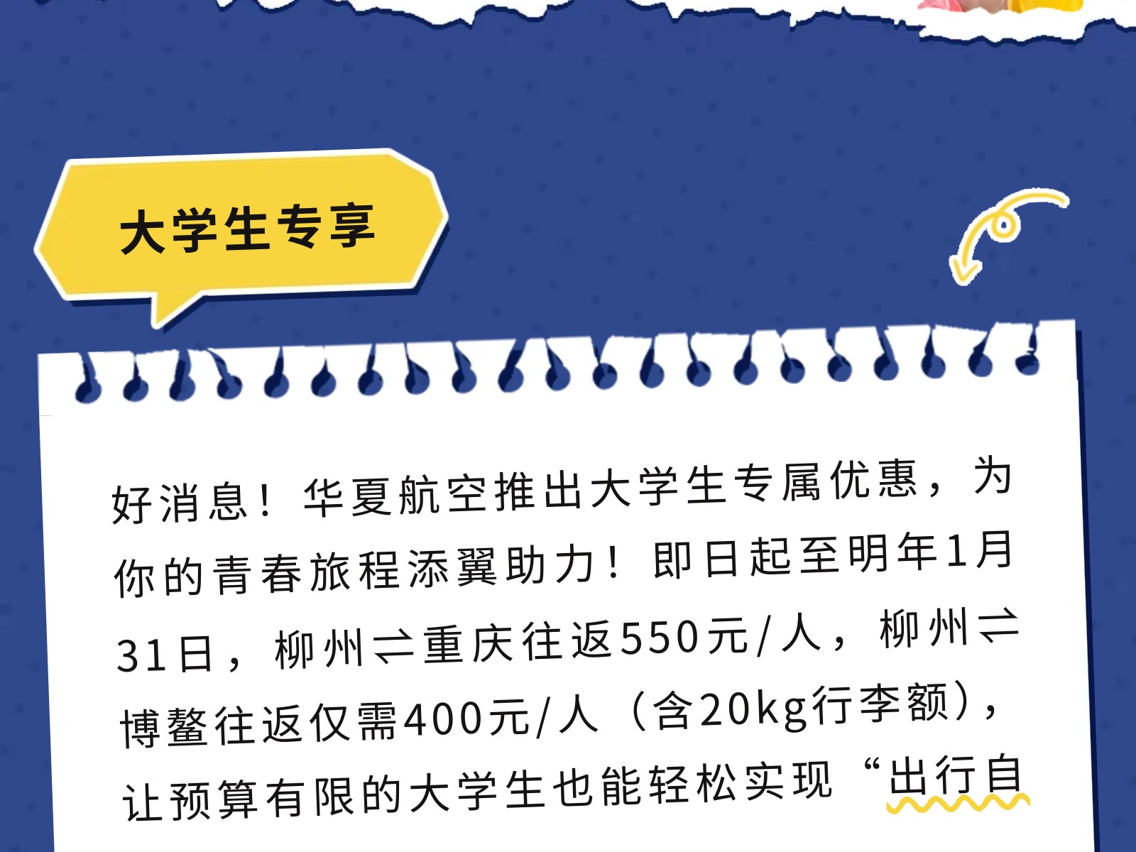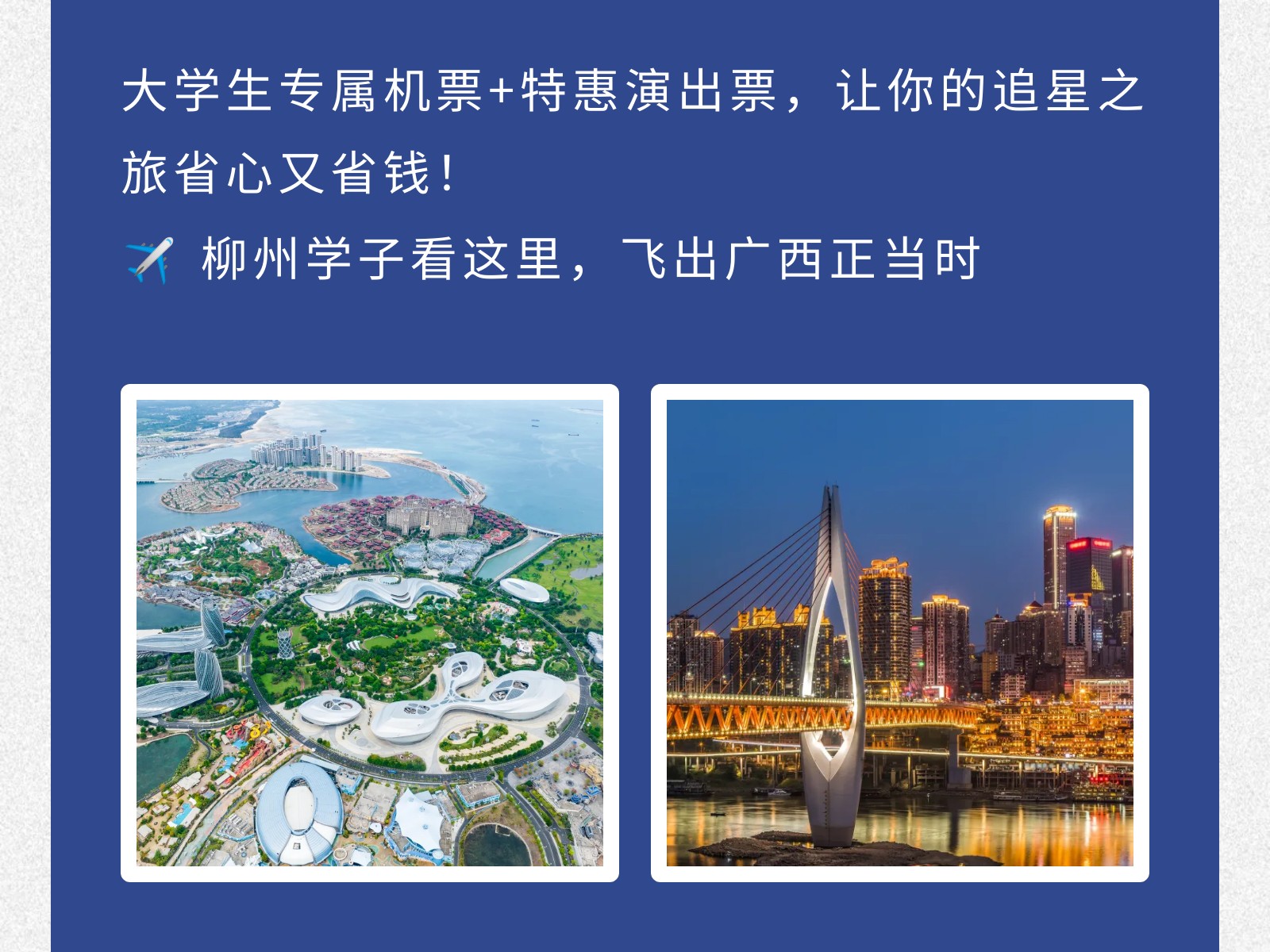 【青春專(zhuān)線(xiàn)】柳州?重慶/博鰲大學(xué)生機(jī)票來(lái)襲!雙向奔赴正當(dāng)時(shí) 發(fā)布時(shí)間:2025年12月02日 10時(shí)來(lái)源:本站原創(chuàng)瀏覽:26 人次