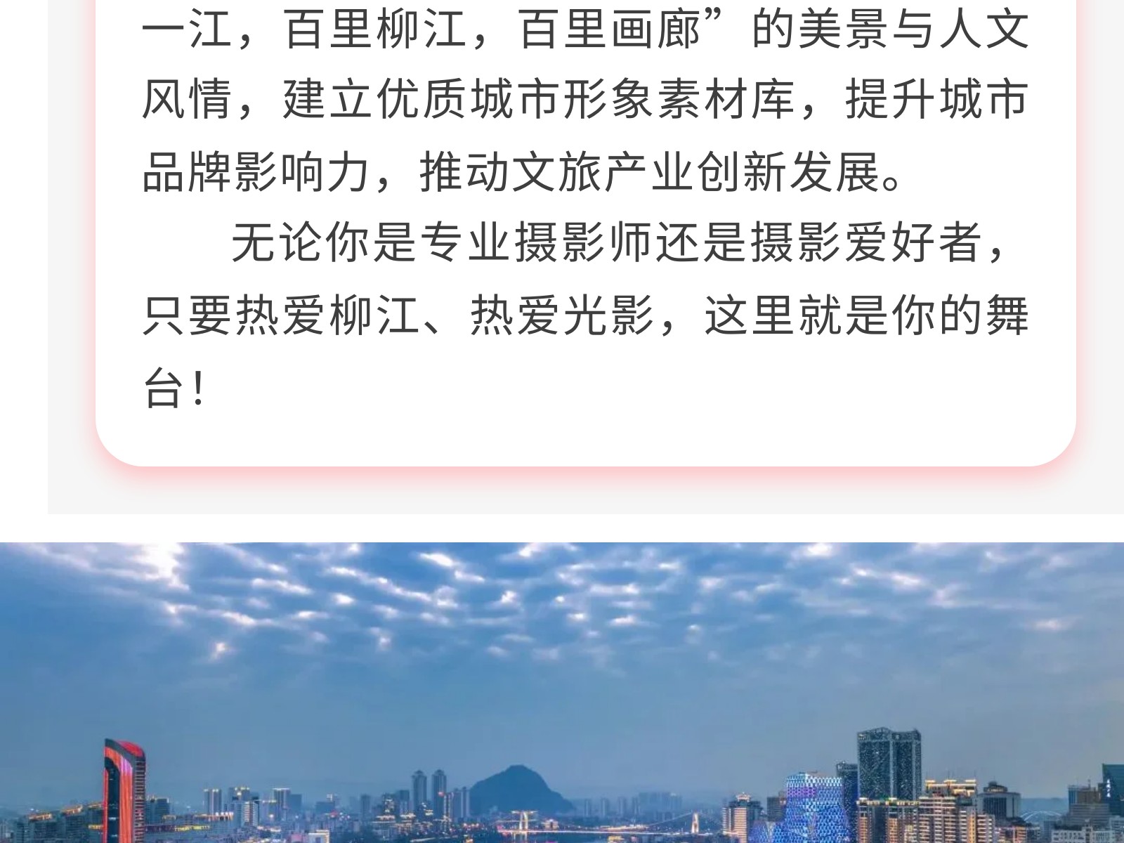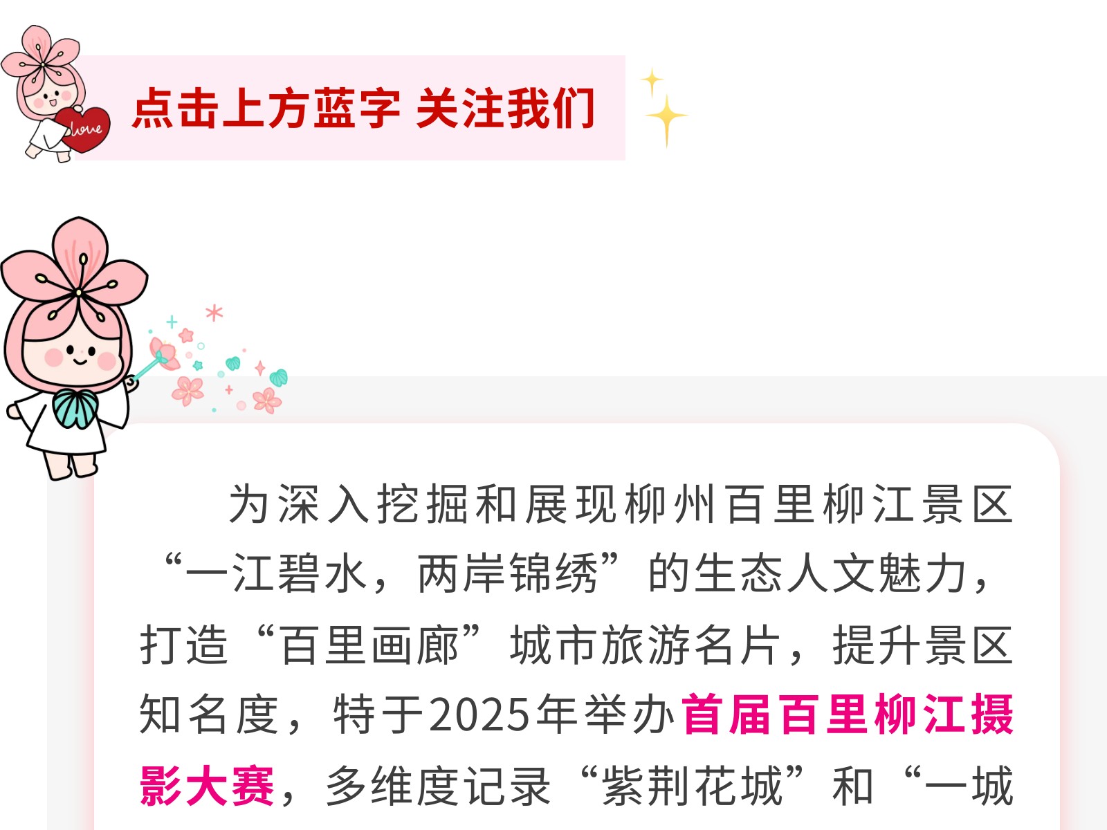 定格最美柳江!首屆“百里柳江”攝影大賽火熱征集中,邀你共賞百里畫廊! 發(fā)布時(shí)間:2025年04月26日 16時(shí)來(lái)源:本站原創(chuàng)瀏覽:94 人次
