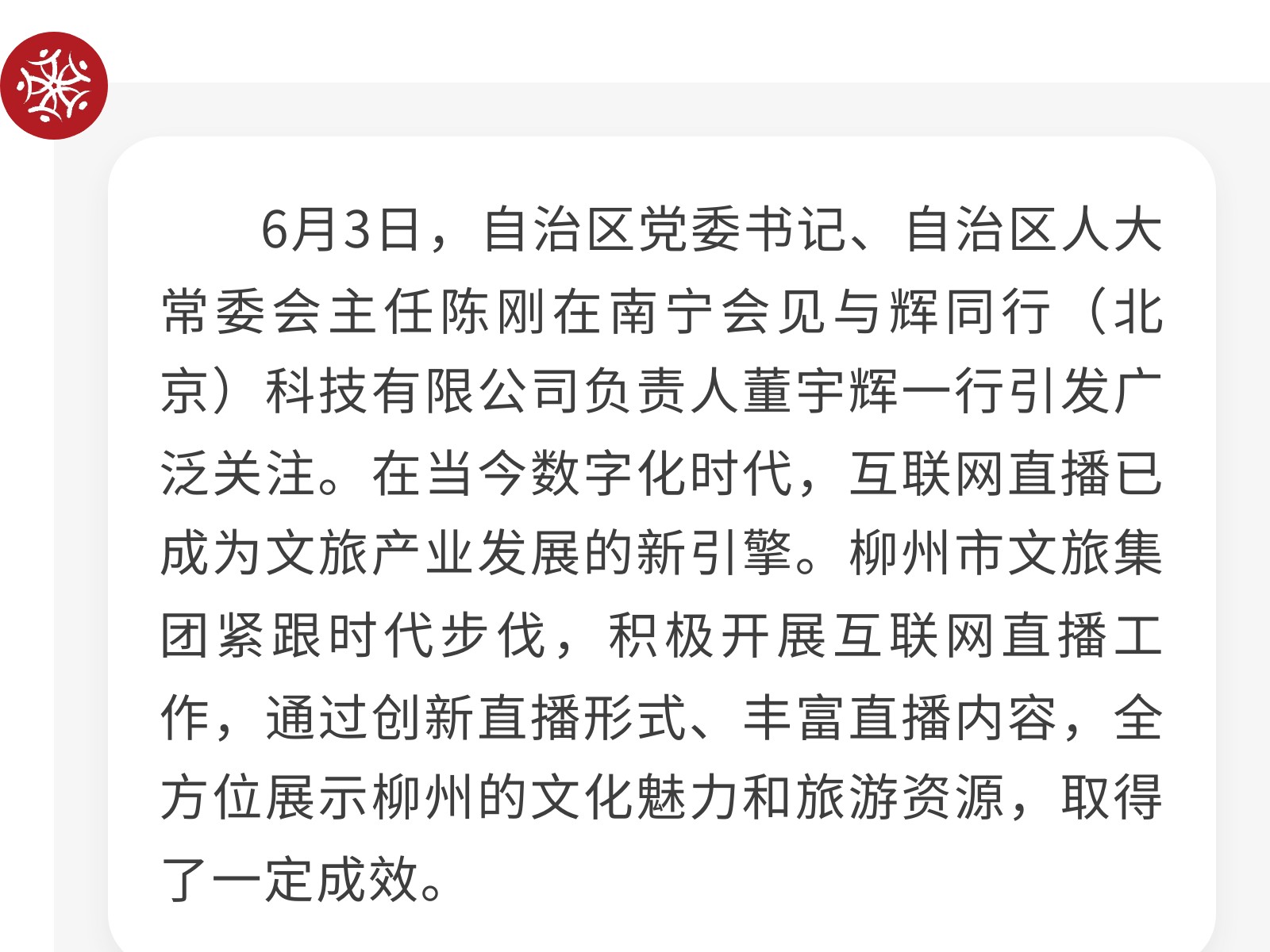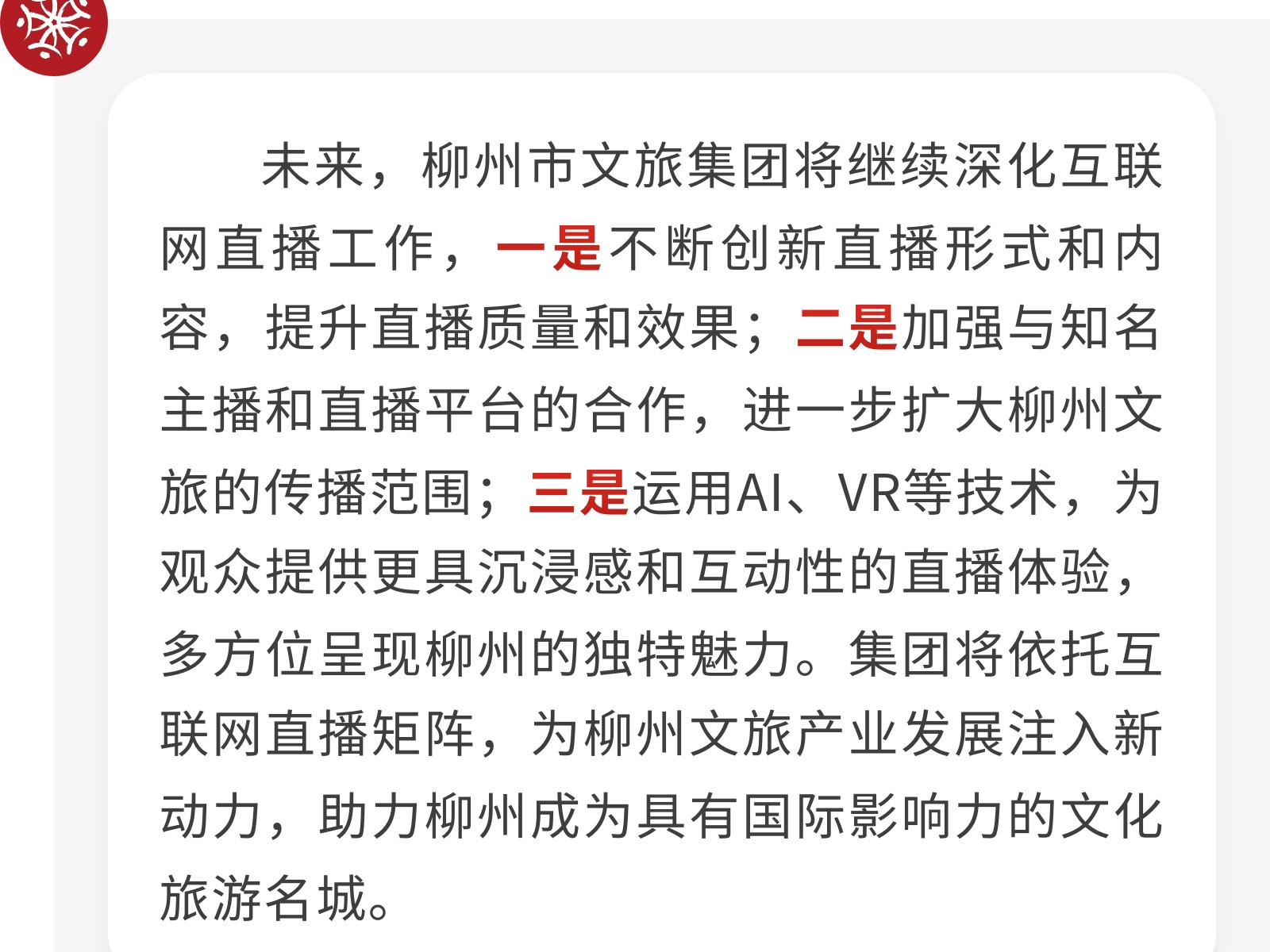 柳州市文旅集團(tuán)積極探索互聯(lián)網(wǎng)直播矩陣,助力城市文旅新發(fā)展 發(fā)布時(shí)間:2025年06月12日 20時(shí)來(lái)源:本站原創(chuàng)瀏覽:36 人次