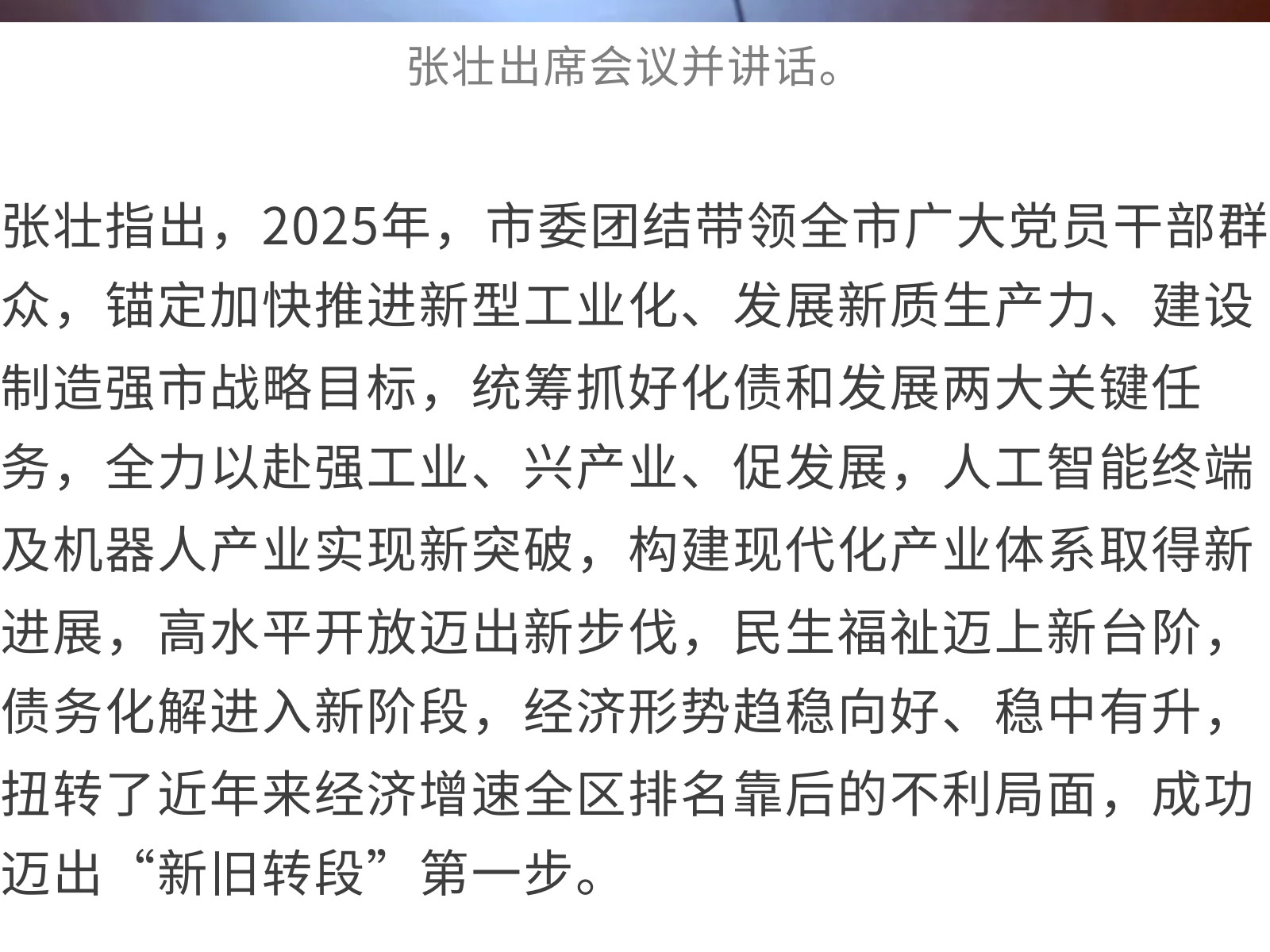張壯在全市經(jīng)濟工作會議上強調(diào),今年要重點抓好八方面工作,確保“十五五”開好局、起好步 發(fā)布時間:2026年01月05日 13時來源:本站原創(chuàng)瀏覽:35 人次