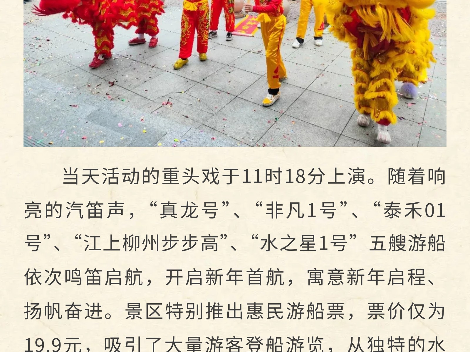 百里柳江景區(qū)“龍馬精神”迎新春,正月初一五船齊發(fā)迎客來(lái) 發(fā)布時(shí)間:2026年02月17日 13時(shí)來(lái)源:本站原創(chuàng)瀏覽:16 人次