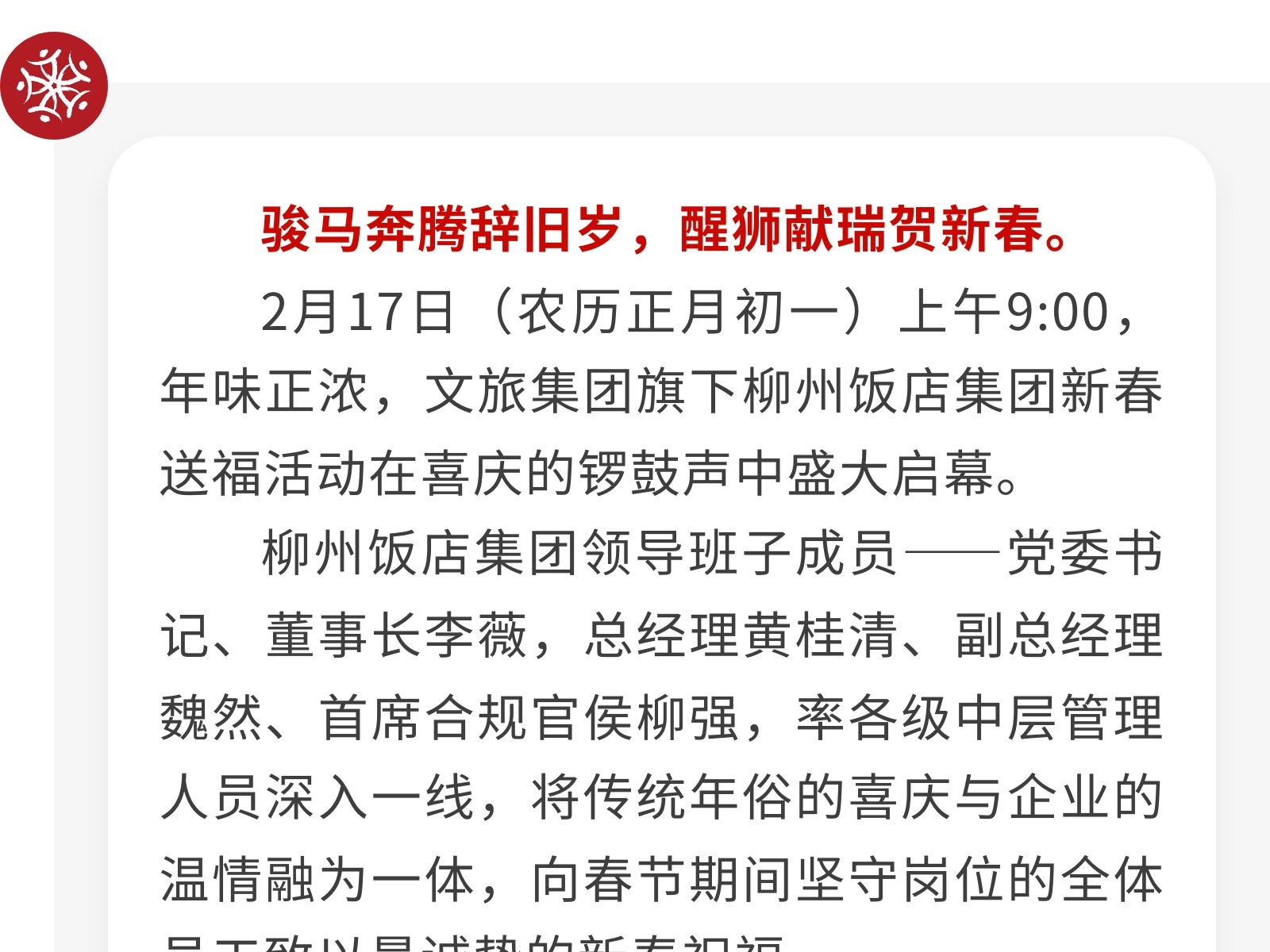 龍騰獅躍賀新春,情暖一線送福至——柳州飯店集團(tuán)開展2026年新春送福慰問活動(dòng) 發(fā)布時(shí)間:2026年02月24日 13時(shí)來源:本站原創(chuàng)瀏覽:15 人次