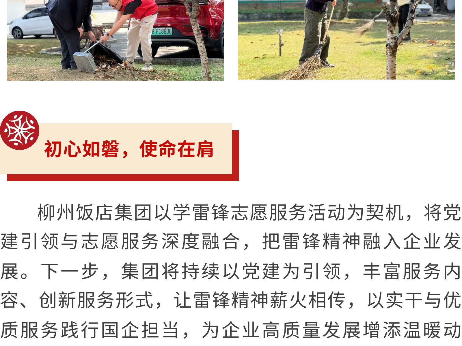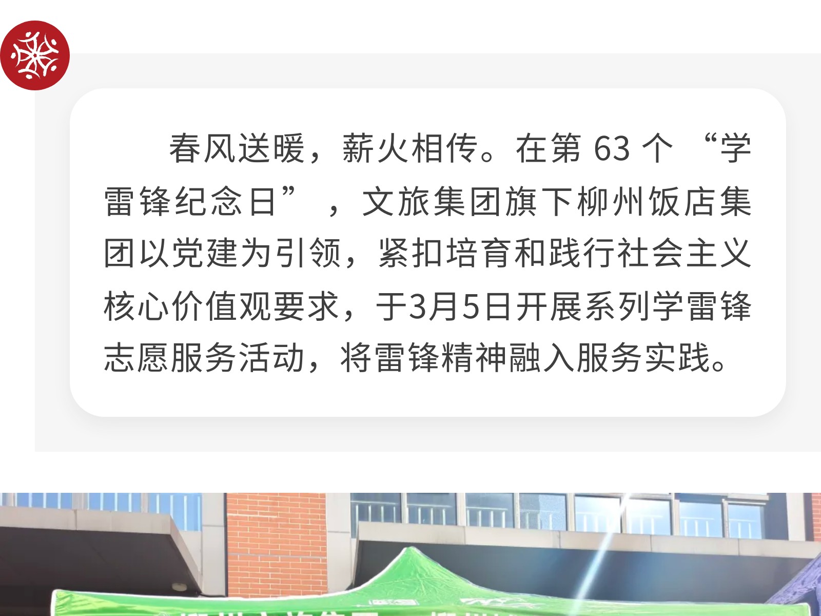 黨建引領(lǐng)聚初心 雷鋒精神綻芳華——柳州飯店集團(tuán)開展學(xué)雷鋒志愿服務(wù)活動(dòng) 發(fā)布時(shí)間:2026年03月10日 09時(shí)來(lái)源:本站原創(chuàng)瀏覽:23 人次